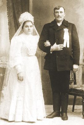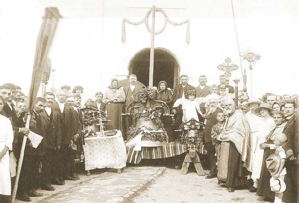 Kende 003, Esküvõ, Maroshordalék-hát, ÚjkÃgyós 1907, Bánfi János és Oláh Margit esküvõi képe Közreadja: ÚjkÃgyósért KözalapÃtvány 5661 ÚjkÃgyós Kossuth u. 41. Tel: 20/ 437-6673